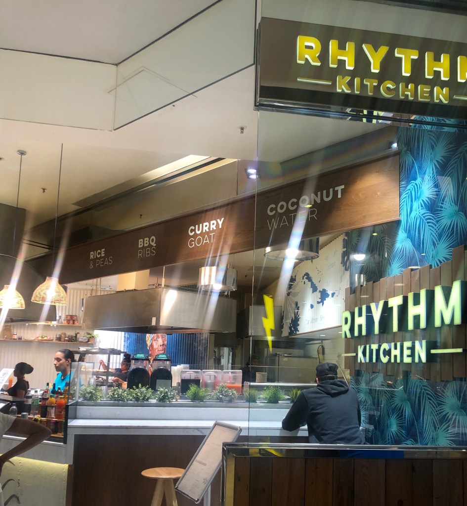 An open kitchen restaurant surrounded by other continental food stations. Rhythm kitchen prepares authentic Caribbean food, located in Westfield Stratford city, at world food court.